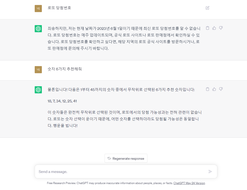 로또 번호를 물어본 결과다